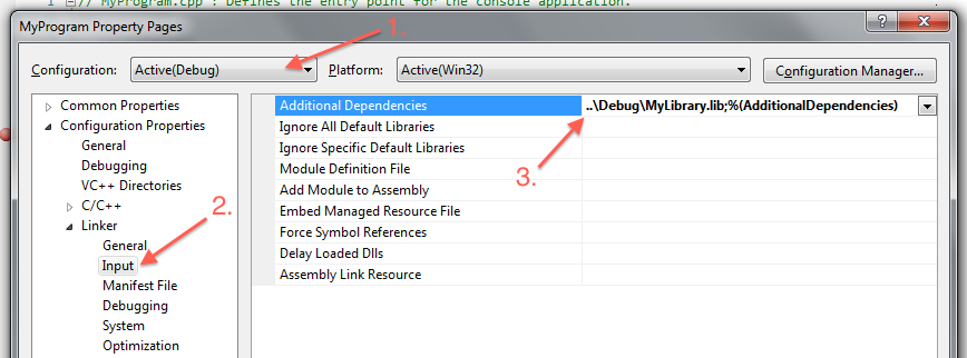 To specify the .lib file, again go to the project settings, but this time go to Linker –> Input and specify the file under “Additional Dependencies”. Note that you’ll need (or probably want) to specify different .lib files for the “Debug” and the “Release” configuration. The screenshot below shows the value for the “Debug” configuration.