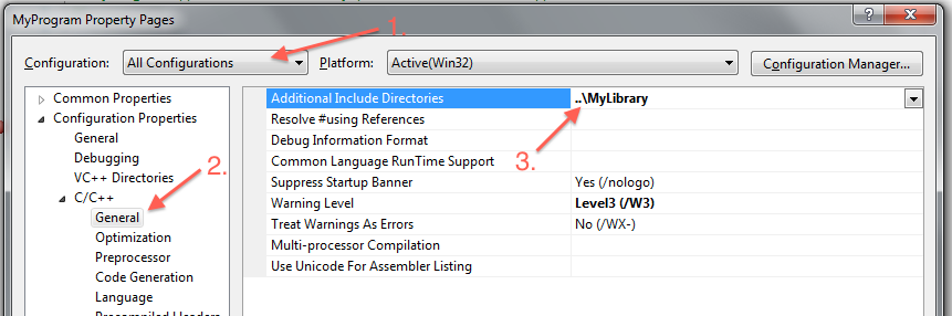 To do this, open the settings of the project that wants to use the library and specify the path under “Additional Include Directories”. You should also make sure that you’ve selected “All Configurations” from the “Configuration” dropdown field (see screenshot).