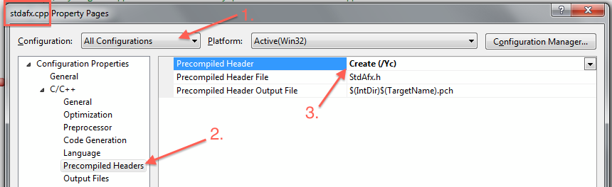 Note that the name of the precompiled header file is the one you specified above (or “stdafx.h” by default).