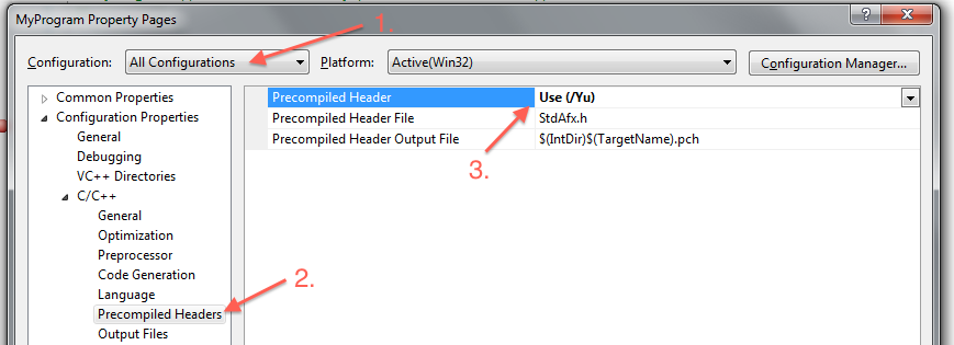 To enable precompiled headers in a project (or file), open the project settings (or file settings) and select “Use” under “C++” –> “Precompiled Headers” –> “Precompiled Header”. Also make sure, that you’ve selected “All Configurations” from the “Configuration” dropdown field. (Note that the option “Create” will be used below.)